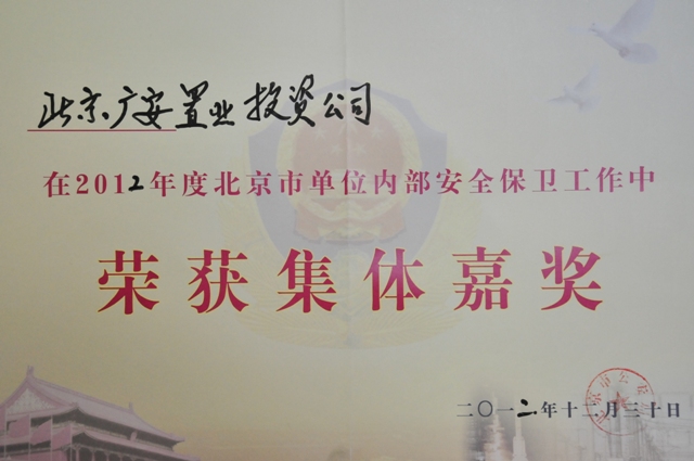 2013年1月10日,經(jīng)首都綜合治理辦公室和北京市公安局批準(zhǔn),北京廣安置業(yè)投資公司被授予“2012年度北京市單位內(nèi)部安全保衛(wèi)集體嘉獎(jiǎng)”榮譽(yù)稱號(hào)。此稱號(hào)是北京市公安局對(duì)廣安置業(yè)在2012年度認(rèn)真落實(shí)治安保衛(wèi)工作制度,并在治安保衛(wèi)工作中取得顯著成績的肯定和表揚(yáng)。